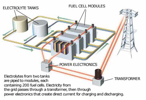 Yet electricity storage is needed more than ever. Power companies are obliged to build supplemental electricity-generating plants, nearly all of which burn fossil fuels, to meet demand during the busiest hours of the day. Just turning those plants on and off emits blasts of pollution. It’s an expensive and wasteful way to generate power, says Nourai. “In your electricity bill, there’s a demand charge, which you have to pay whether you used the electricity or not. Why? Because a big generator has been purchased for the day that you need that power.” What’s more, the dearth of storage means more transmission lines are needed to respond to peak power demands, a job strategically placed giant batteries could perform with greater efficiency. The reality is that those transmission lines aren’t being built. They’re about as popular as a hydroelectric storage lake, and they are uglier. As a result, the stressed-out transmission network is not always able to provide the steady supply of electricity required to run sophisticated electronic equipment. A single fallen tree limb can send shock waves down overloaded lines, causing nervous breakdowns in the communications servers, hospital equipment, home computers, and other digital devices that account for about 10 percent of U.S. power consumption. Indeed, gridlocked power lines contributed to the crisis that nearly bankrupted California two summers ago, when energy traders were exploiting supply constraints and manipulating electricity flows to drive up prices. Only a deflated economy and dampened demand spared New York and other states with badly congested lines from similar woes. “A great deal of the market imperfections in terms of price spikes and the ability to game the market, the Enrons of the world, and so forth, are purely a result of the fact that we do not have large-scale storage capabilities distributed uniformly throughout the system,” Yeager says. Flow batteries offer a mechanism for providing that large-scale storage. You can put them in the plains of North Dakota or next to a power plant in New York City. Unlike conventional batteries, they can charge and discharge power without deteriorating. And unlike other energy-storage devices such as ultracapacitors and flywheels, which pack only enough energy to snuff out brief voltage fluctuations, flow cell batteries have the ability to store enough power to unburden a transmission line for several hours or to store gusts of nighttime wind power. Like the fuel cells being developed for cars,